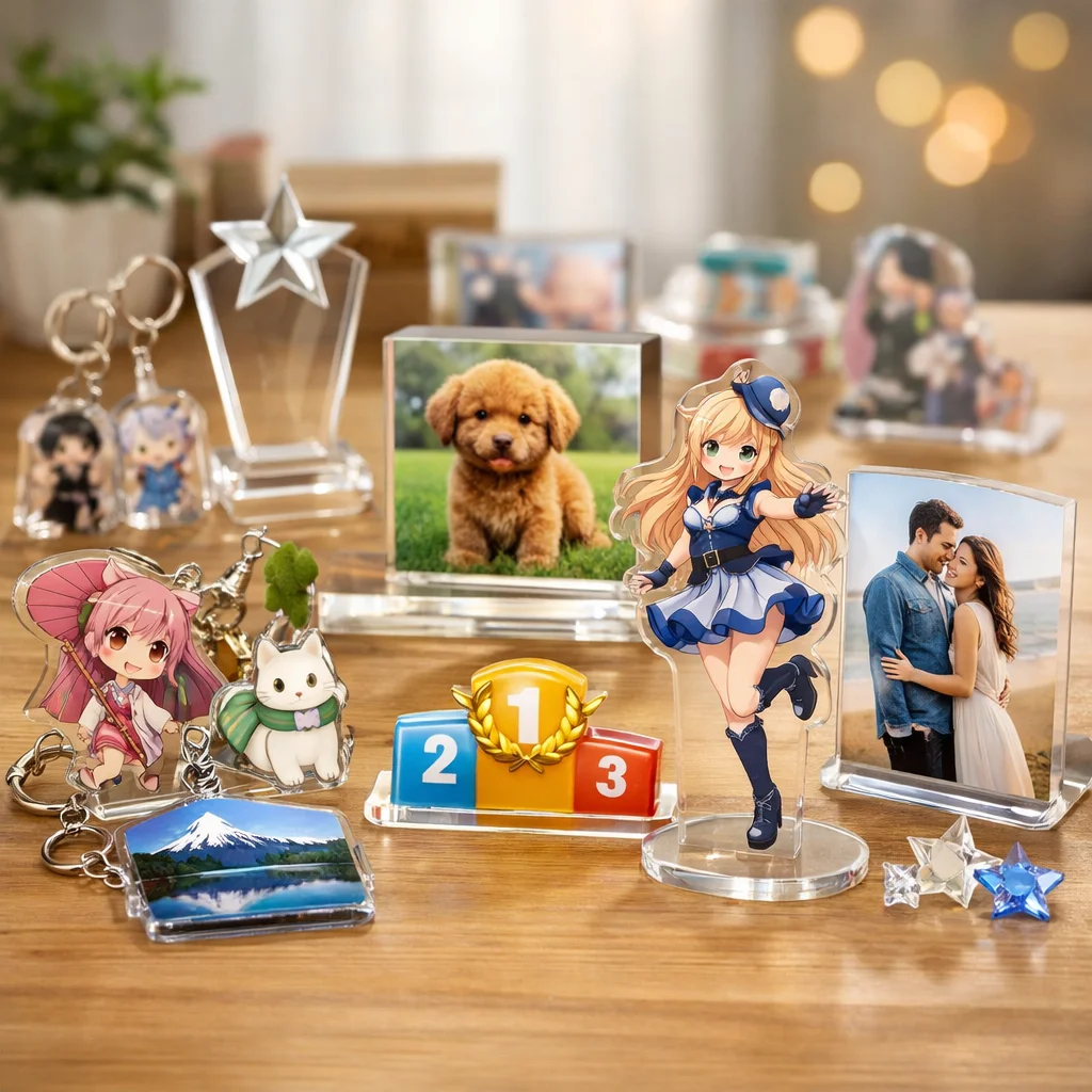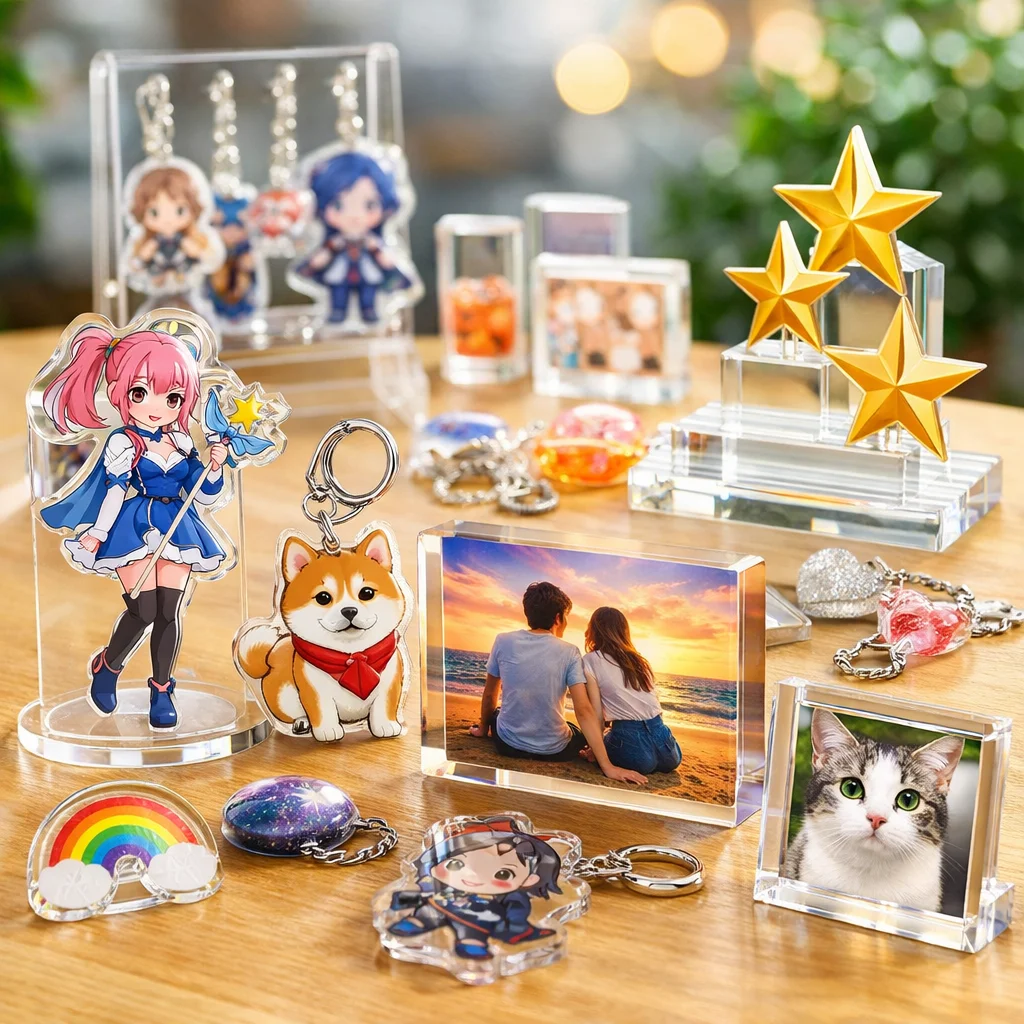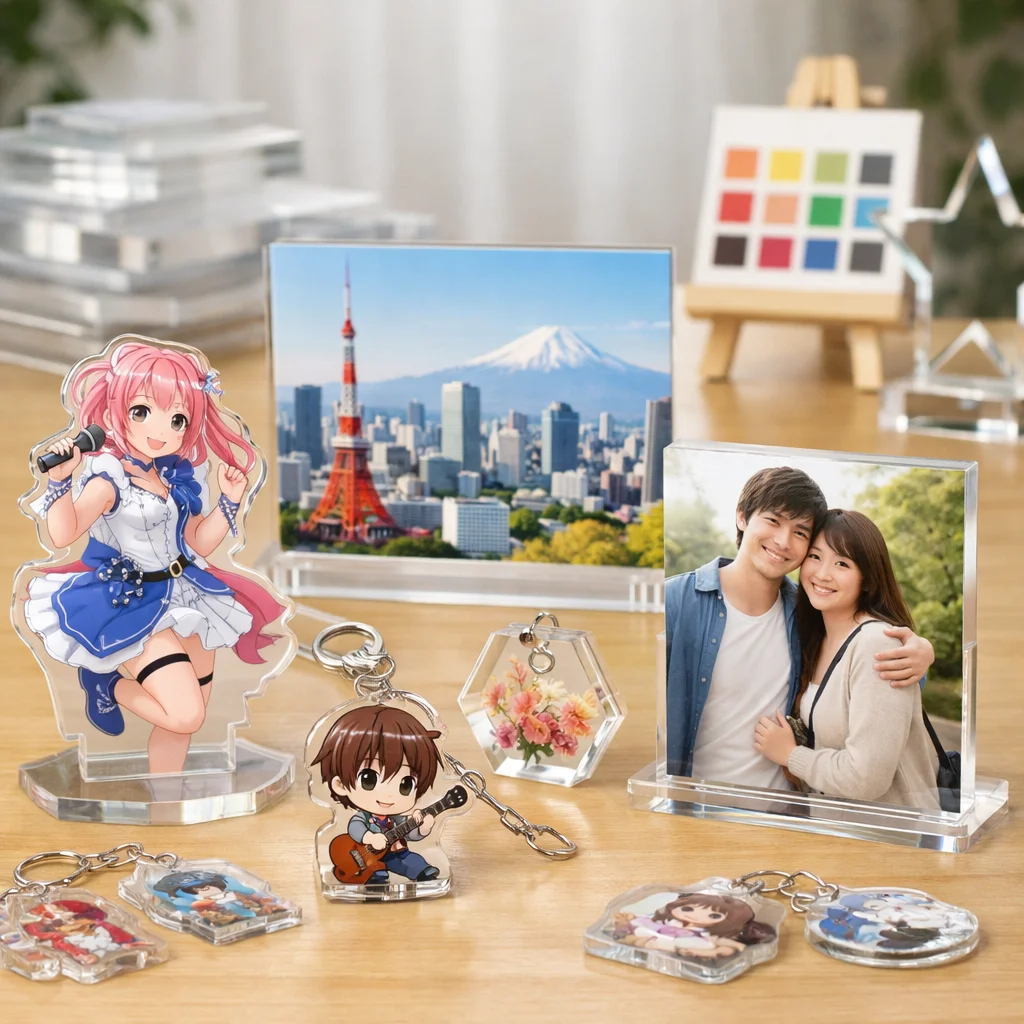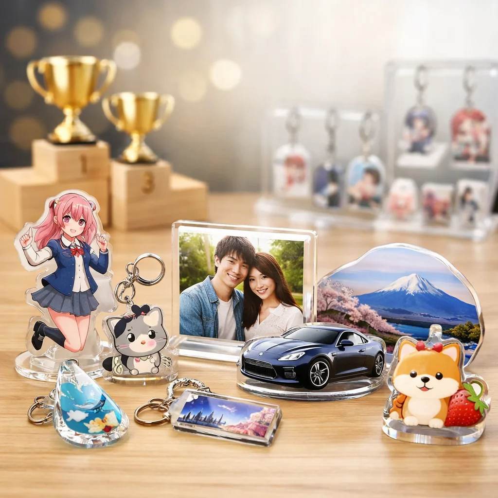 アクリルグッズは多様なデザインと高い加工技術を持っているため、あらゆる目的やシーンにマッチします。特に、個性的なアイテムを作りたい方やプレゼントを探している方には非常に向いています。お気に入りのアクリルグッズを見つけて、その魅力を楽しんでください。