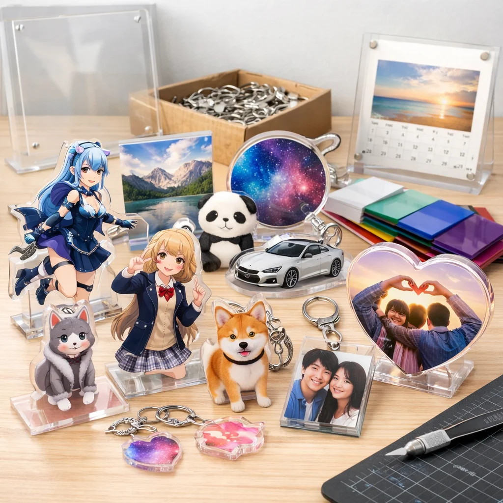 アクリルグッズは、近年多くの人々に親しまれています。代表的なアイテムには、アクリルキーホルダー(アクキー)、アクリルスタンド(アクスタ)、アクリルバッジ、コースター、フォトブロック、アクリルパネル、ルームプレートなどがあり、それぞれ異なる用途で利用されています。ここでは、これらのアクリルグッズを「用途」「おすすめシーン」「選ぶポイント(厚み/サイズ/付属パーツ)」に分けて詳しく紹介します。