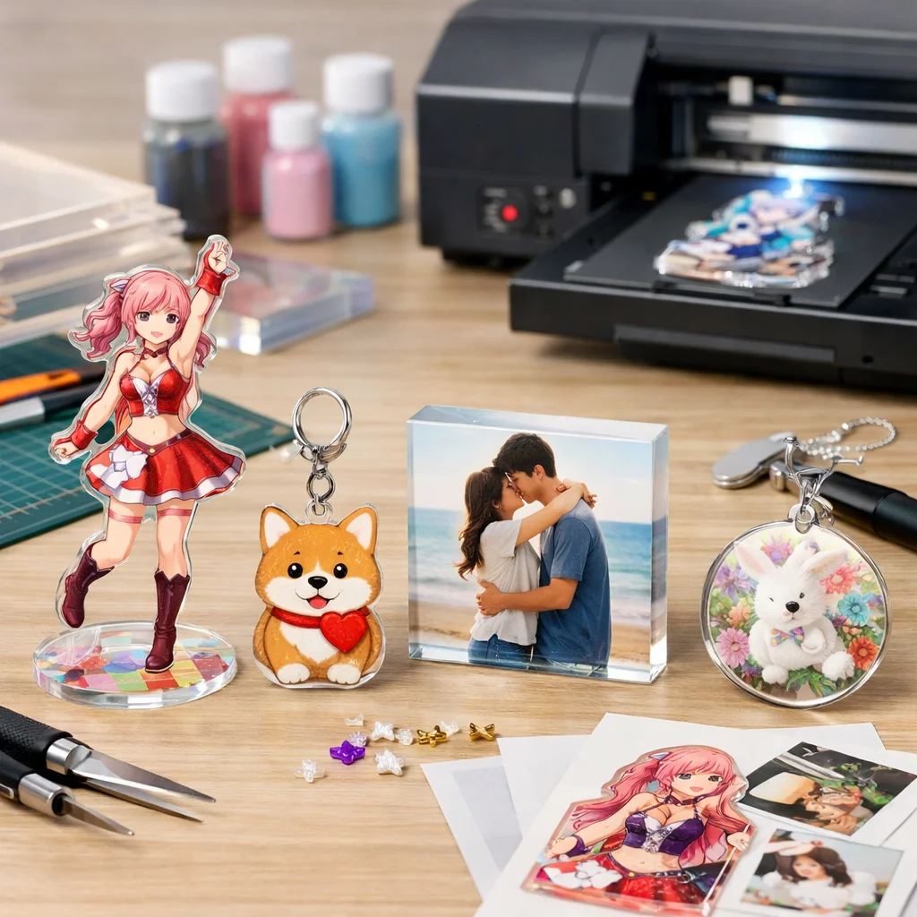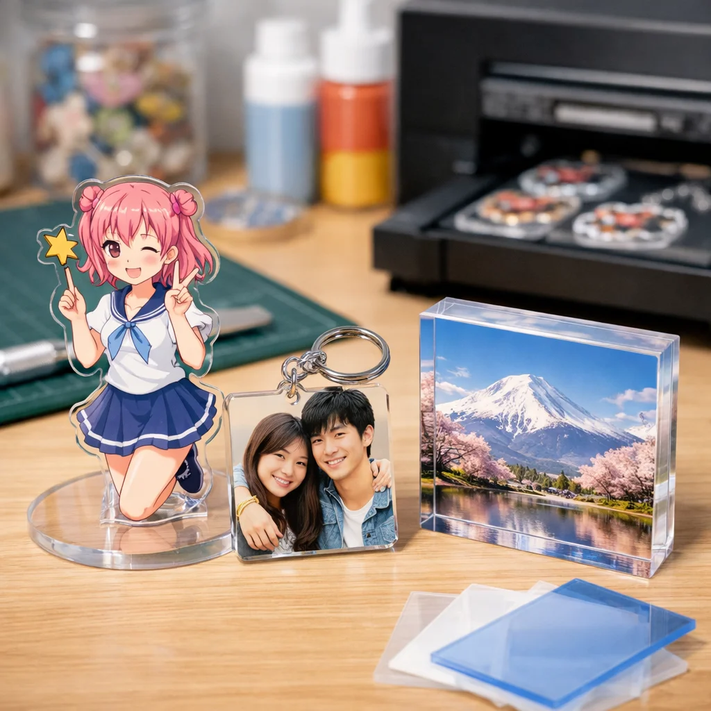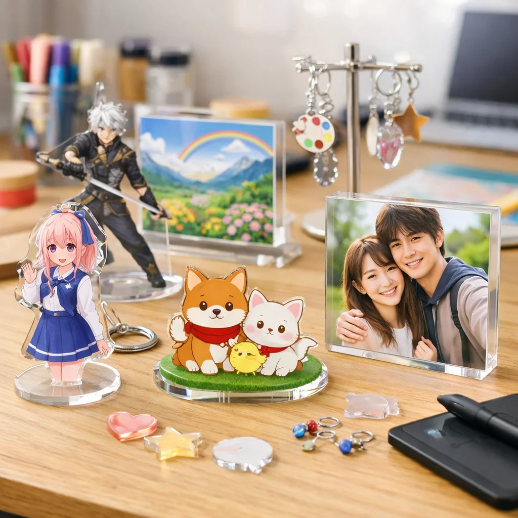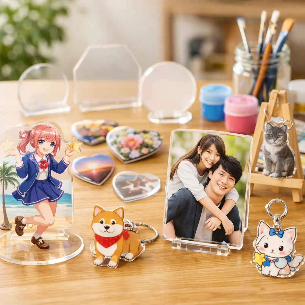 現在、アクリルグッズの世界では、さまざまなアイテムが注目されています。特に、アクリルスタンド(アクスタ)、アクリルキーホルダー(アクキー)、アクリルブロック(アクブロ)、アクリルバッジ、フォトプロップス、チャーム、そしてスタンド付きアイテムが人気のカテゴリーとして挙げられます。これらのアクリルグッズは、特にキャラクターやアートのファンから強い支持を受けており、個性を表現するアイテムとして重宝されています。