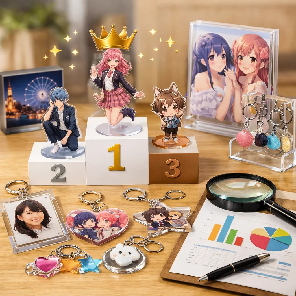 これらの要因により、アクリルグッズ市場は今後も拡大が期待されます。現在、アクリルグッズを購入・制作することで、ファン活動の充実や収集の楽しみを得ることができます。また、アクリルグッズの人気や評判をランキングや比較を通じて把握することで、より満足度の高い選択が可能となります。