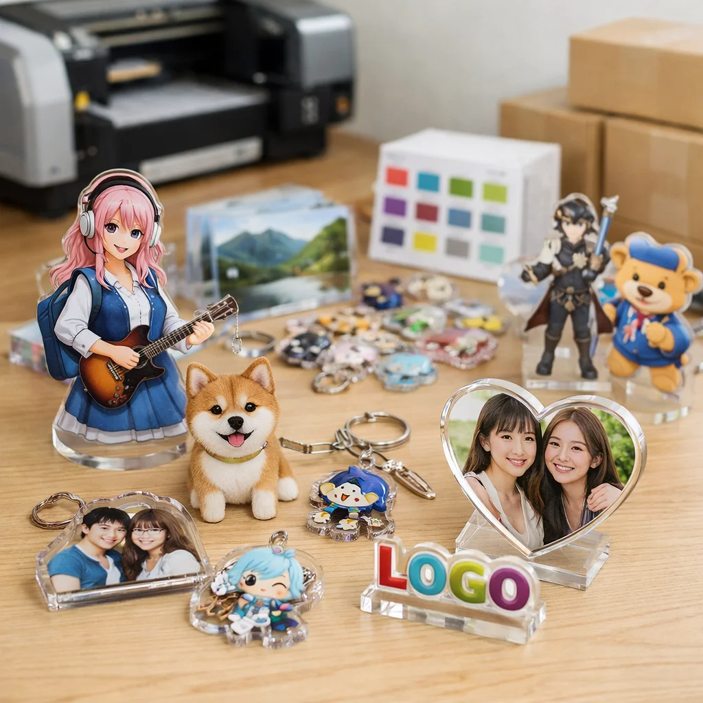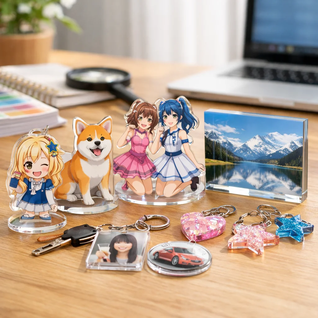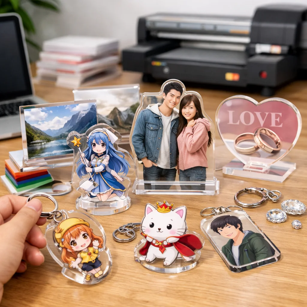 アクリルグッズは、軽量で透明度が高く、加工が容易なため、さまざまな形状やデザインに対応できます。これにより、企業のロゴやキャラクターを鮮明に印刷することが可能で、プロモーションや販促活動に最適です。また、色彩の再現性が高く、複雑なデザインやグラデーションも忠実に表現できます。