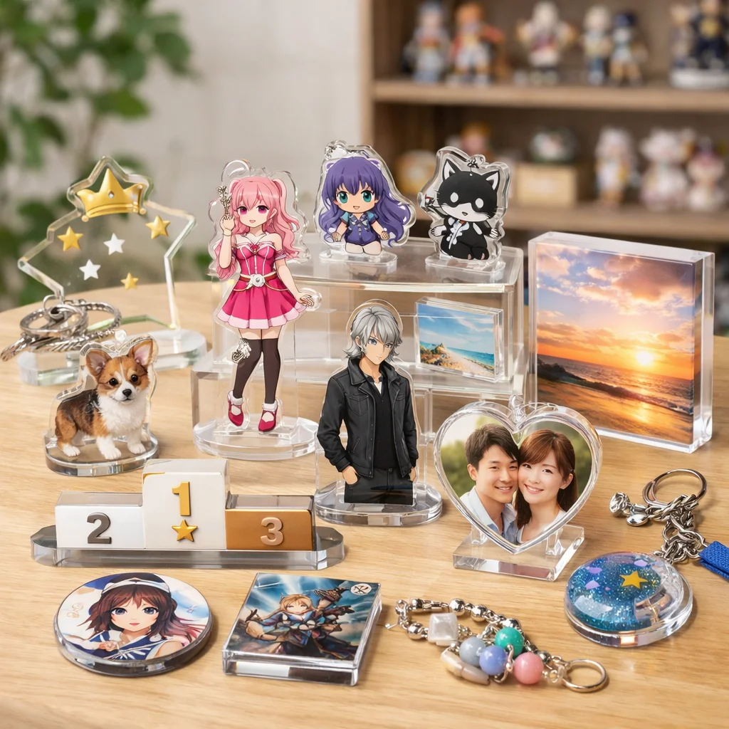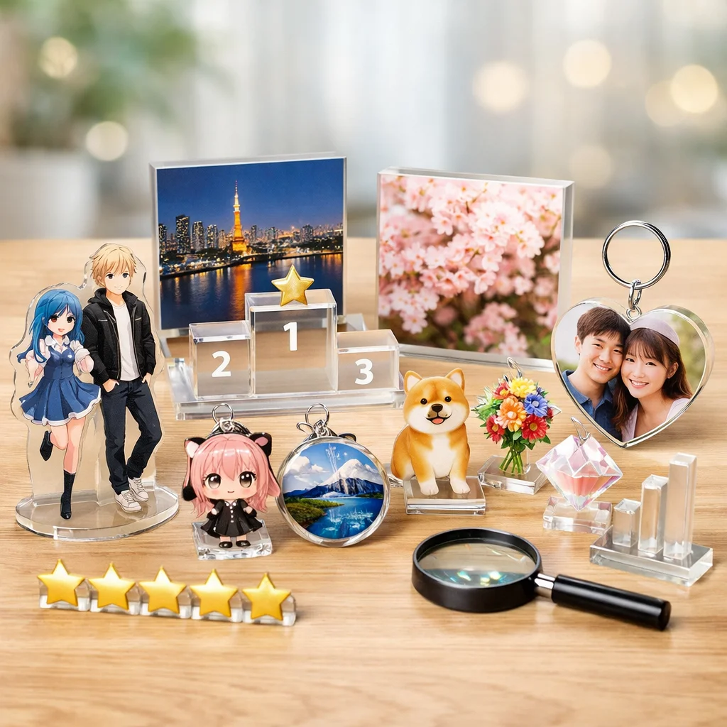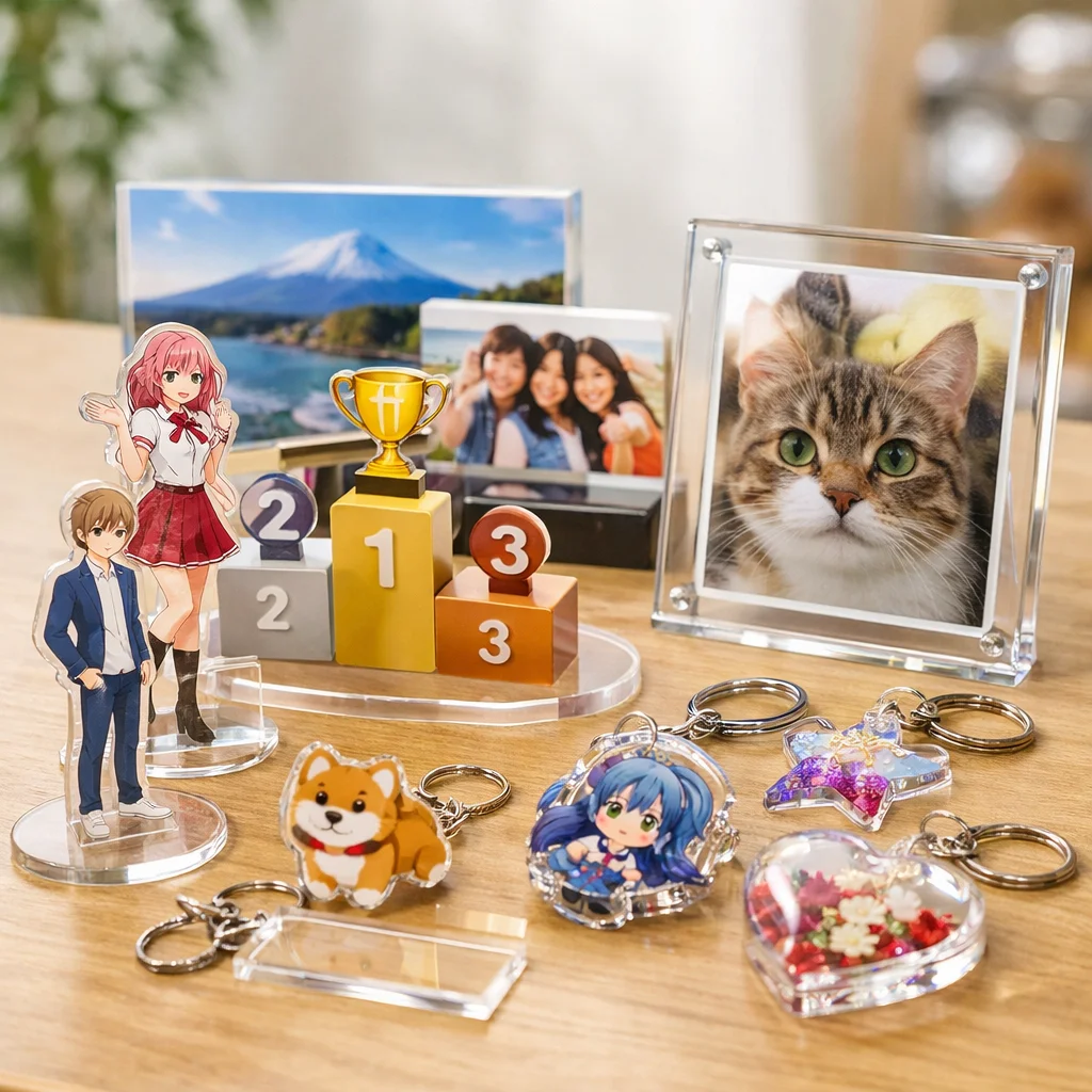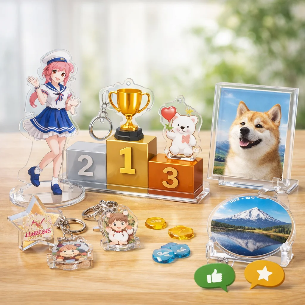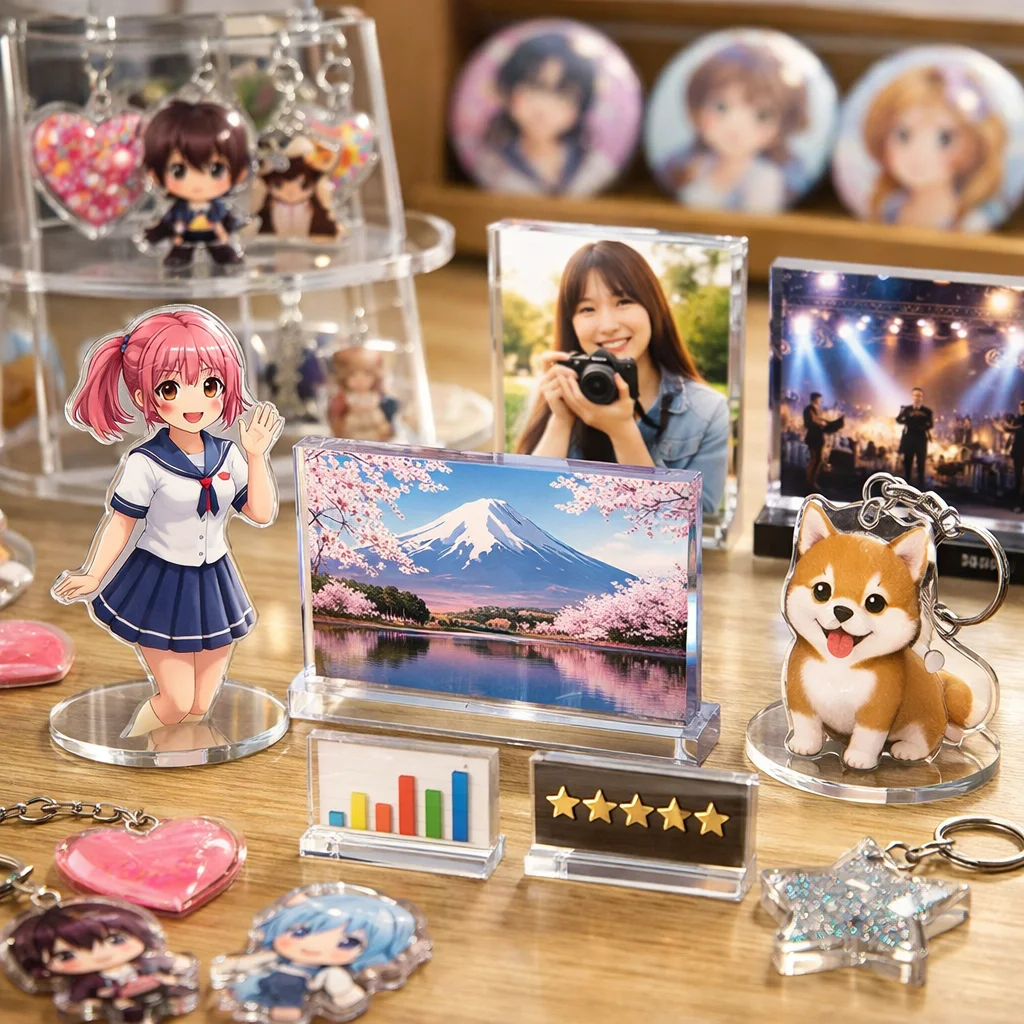 アクリルグッズは、キャラクターやアートを身近に感じられるアイテムとして多くのファンに愛されています。代表的なカテゴリにはアクリルスタンド(アクスタ)、アクリルキーホルダー(アクキー)、アクリルバッジアクリルブロックアクリルプレートなどがあり、それぞれ異なる魅力を持っています。本記事では、これらアクリルグッズの評判や口コミをもとに、比較のポイントを詳しく解説していきます。