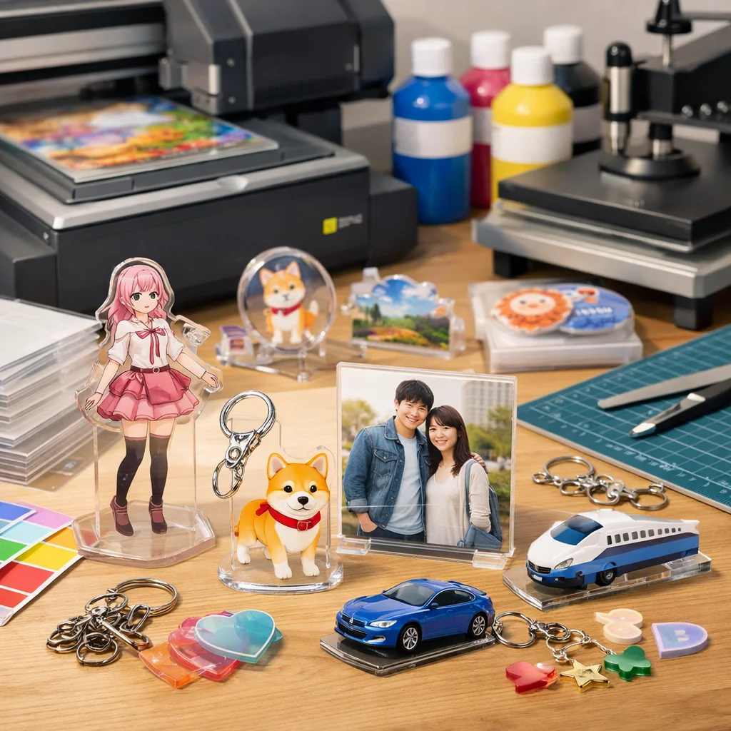 アクリルグッズは、その多様性とカスタマイズの幅広さから、個々のニーズに応じた商品が揃います。アクリルグッズの中でも代表的なジャンルとして、アクリルキーホルダー(アクキー)、アクリルスタンド(アクスタ)、アクリルブロック(アクブロ)、アクリルチャーム(アクチャ)、アクリルバッジなどがあります。これらは、同人活動や企業ノベルティ、アーティストの物販、さらには学校や部活の活動に至るまで、用途に応じてさまざまなシーンで活躍します。