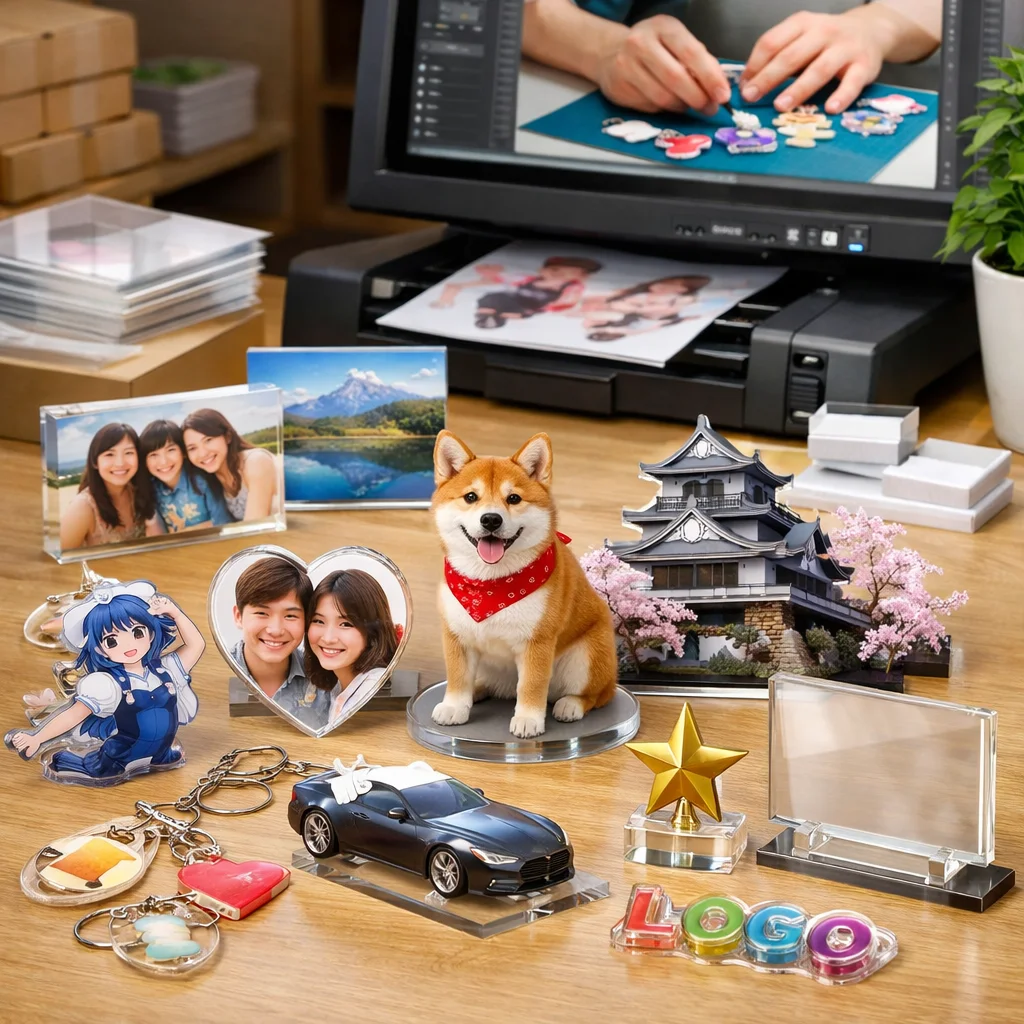 初心者が選びやすいおすすめの組み合わせとしては、厚みは4mm、透明度は高く、UV印刷とレーザーカットを選ぶことを推奨します。この組み合わせは、見栄えが良く、耐久性も高いため、さまざまな用途に適しています。また、加工によってオリジナリティを加えたい場合には、グロス仕上げを選ぶことで商品独自の魅力を引き出せます。