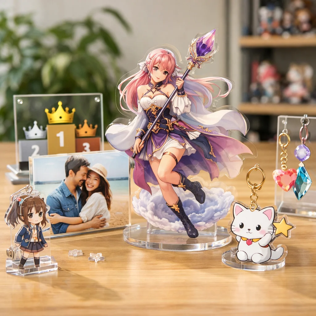 アクリルスタンドは、多様なデザインと機能性が特徴のアクリルグッズとして人気を集めており、多くの人に愛されています。特に、アクリルスタンドは「本体」「台座」「差し込み」といった構造を持ち、さまざまなスタイルやテーマで展開されるため、選ぶ楽しみが増えています。