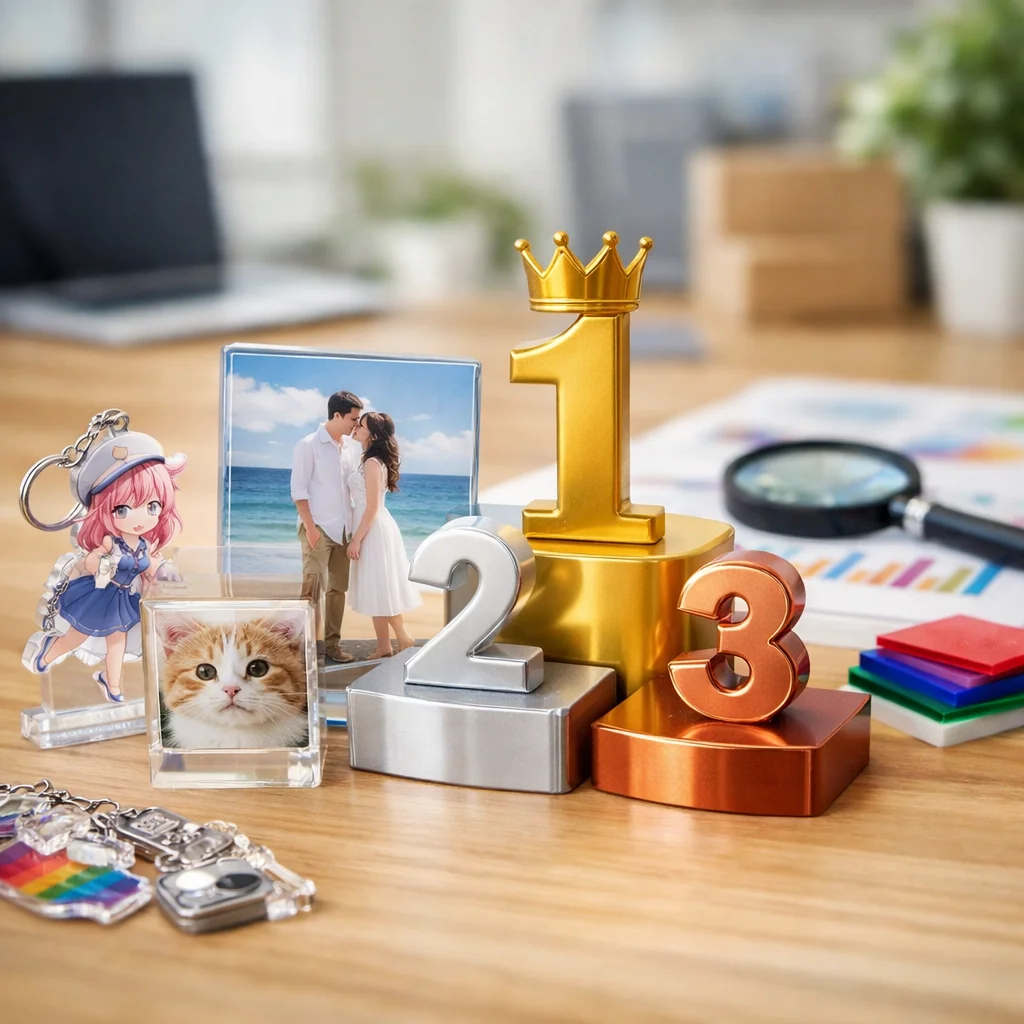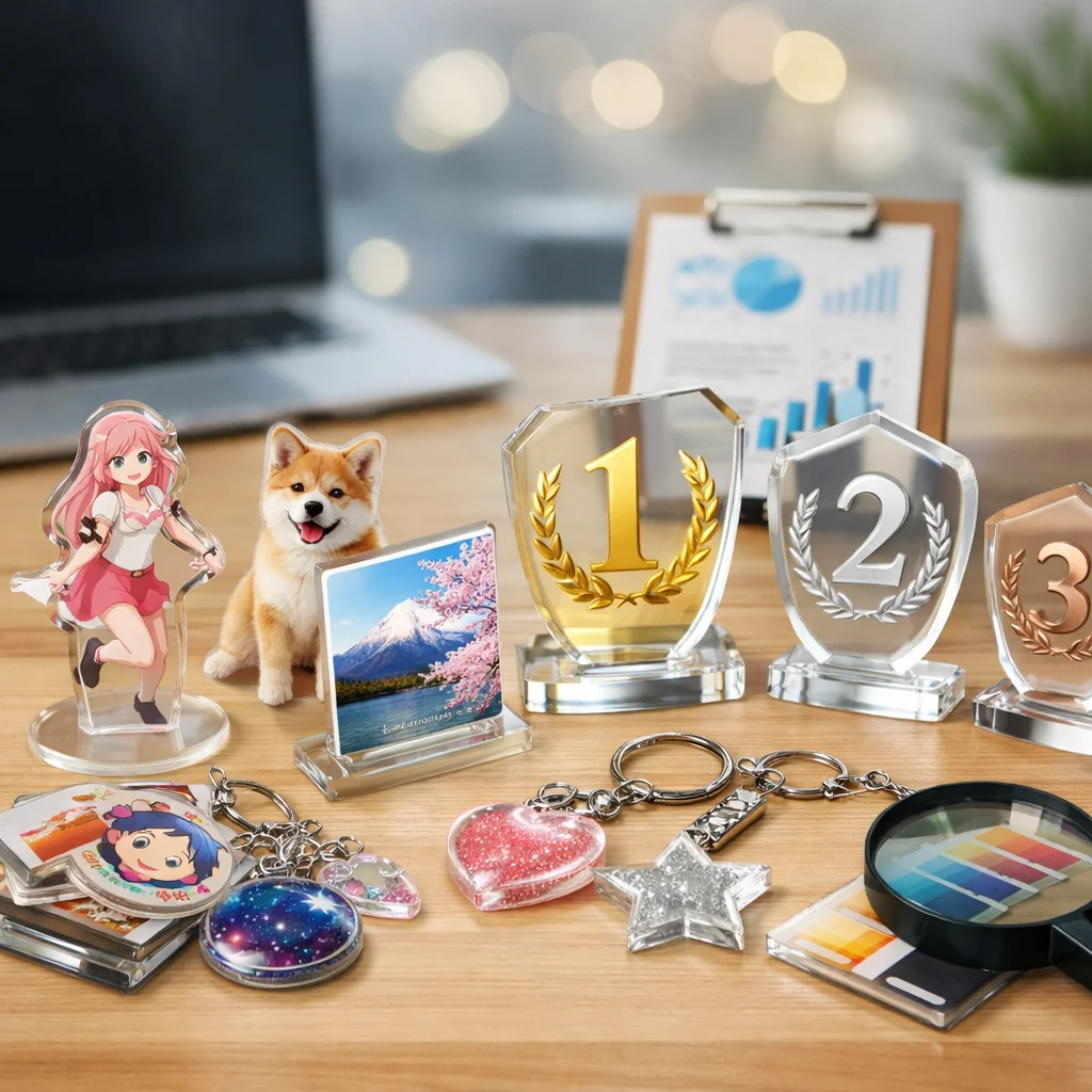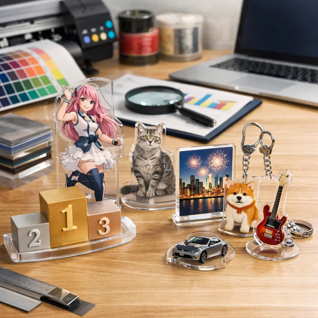 アクリルグッズ市場は、近年多様なトレンドとともに進化を遂げています。以下に、高付加価値加工、短納期化、小ロット多品種、エコ素材/包装削減、UV印刷の高度化、そして推し活需要といった主要な動向を仮説としてご紹介します。
