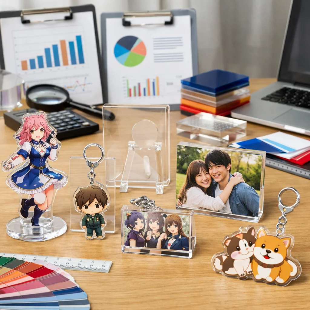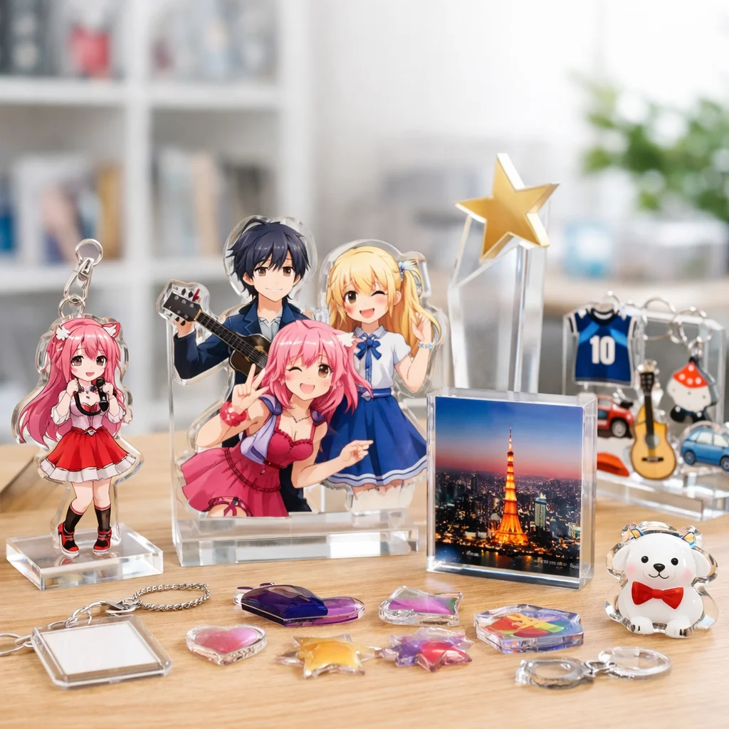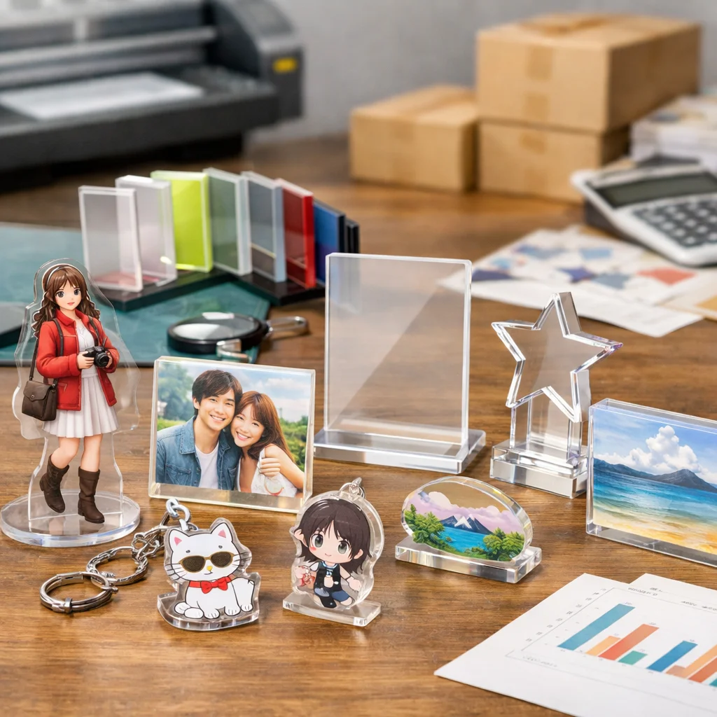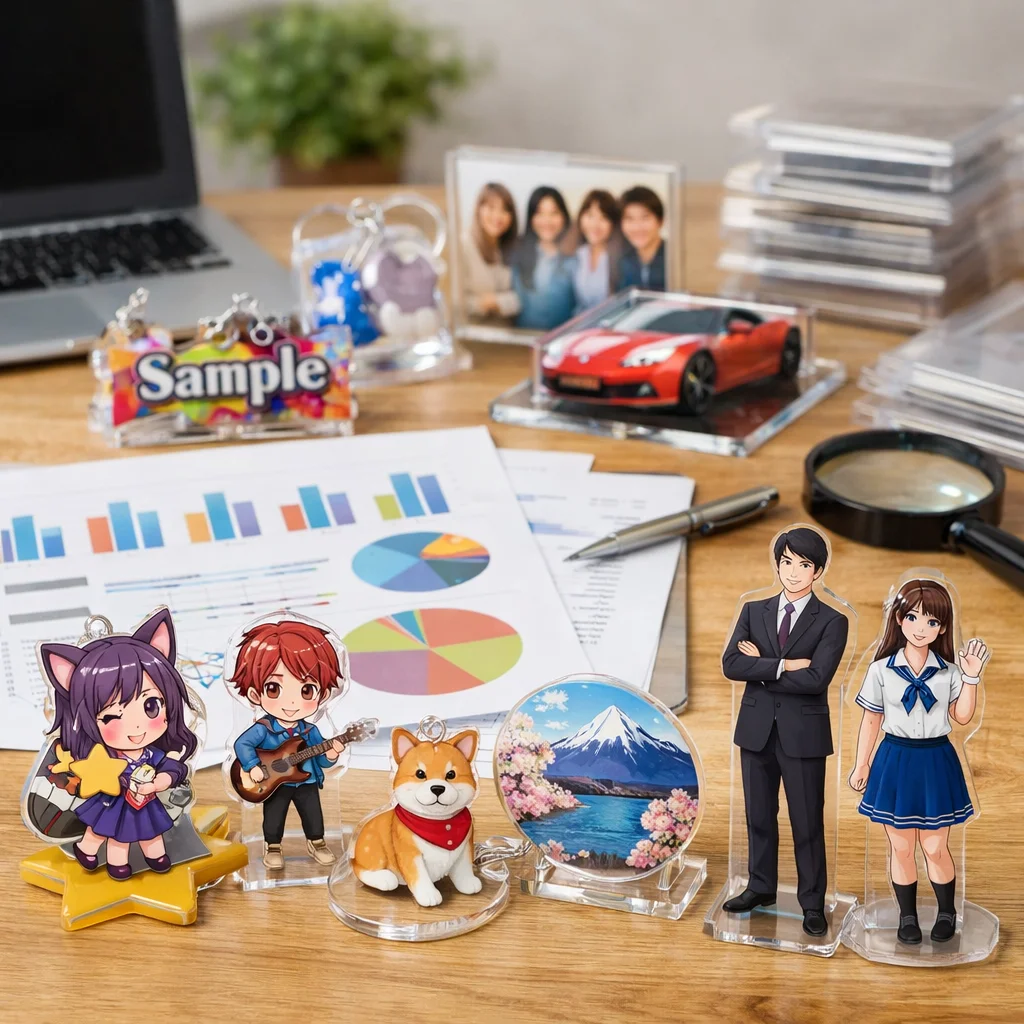 まず、アクリルグッズのサンプルには主に以下の三種類があります。これらのサンプルそれぞれが持つ特性を理解することが、成功するアクリルグッズ制作には不可欠です。