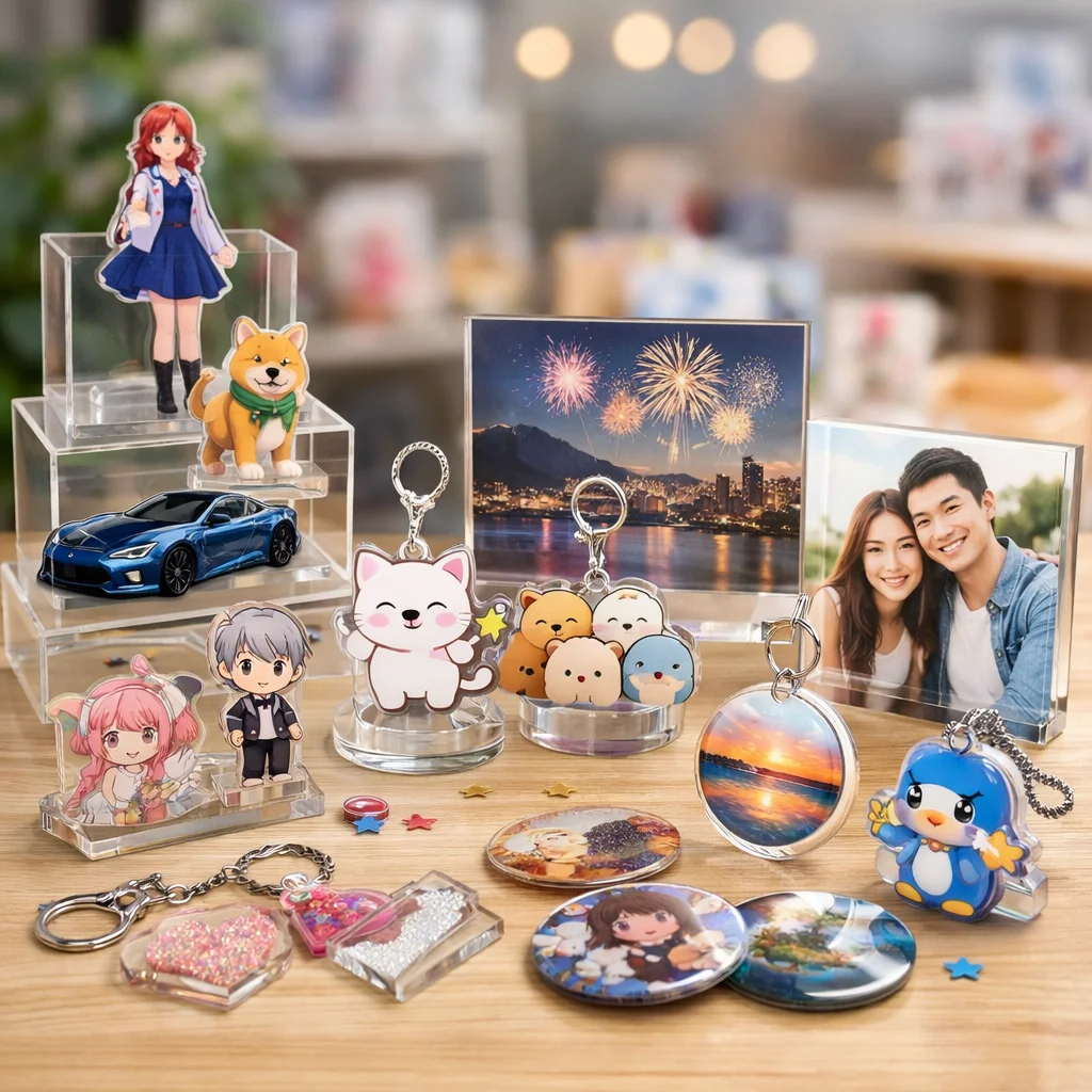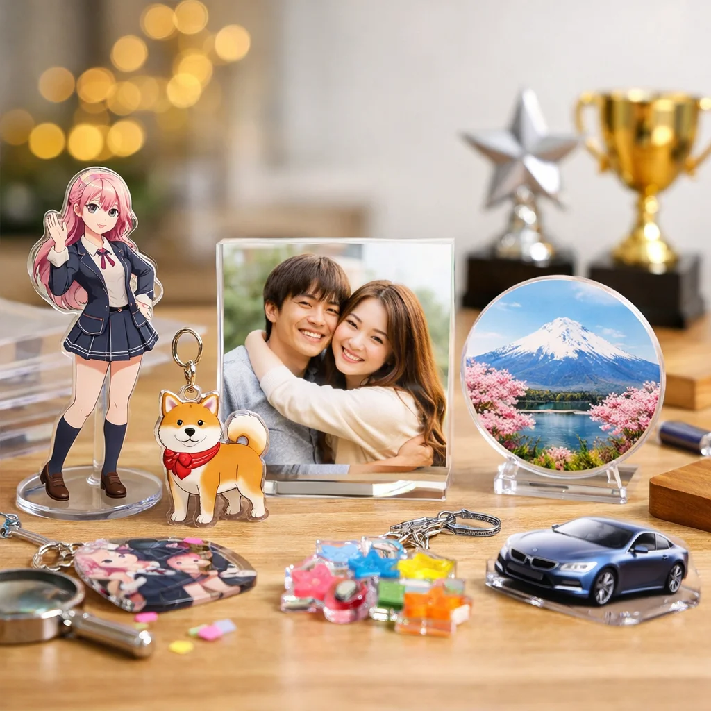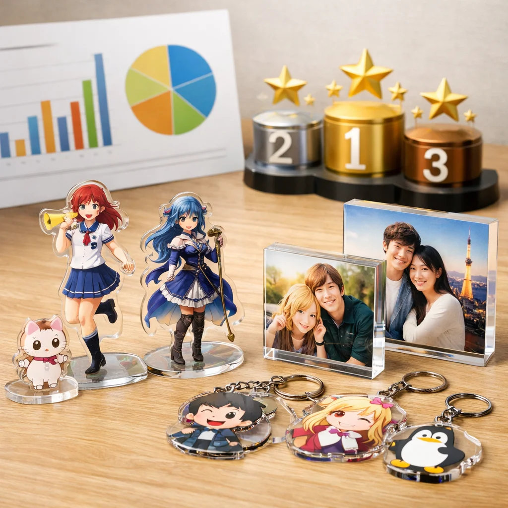 参考: 【2025年版】UVプリンターの特徴とメーカー別比較_基礎編 アクリルグッズ市場のトレンドと今後の展望![]() アクリルグッズ市場は、近年急速に拡大しており、デザイン、加工技術、購買行動、そしてイベント需要の各側面で顕著な変化が見られます。これらのトレンドを制作側と購入側の視点から整理し、今後の方向性を探ります。 デザインのトレンド アクリルグッズのデザインは、シンプルでありながら機能的なものが好まれる傾向にあります。特に、透明感を活かしたミニマルなデザインや、カラーバリエーションを豊富に取り入れた製品が人気を集めています。これにより、アクリルグッズの市場は多様化し、消費者のニーズに応える製品が増加しています。 加工技術の進化 アクリルグッズの製造において、レーザー加工やUV印刷などの高度な技術が導入されています。これらの技術により、複雑なデザインや高精度な加工が可能となり、製品の品質向上と多様化が実現しています。また、環境への配慮から、リサイクル可能なアクリルグッズの需要も高まっています。 購買行動の変化 消費者の購買行動は、オンラインショッピングの普及とともに変化しています。特に、SNSを活用した情報収集や口コミが購買決定に大きな影響を与えています。これにより、アクリルグッズの販売戦略もデジタル化が進み、オンラインでのプロモーション活動が重要視されています。 イベント需要の増加 アクリルグッズは、企業のプロモーション活動やイベントでの記念品としての需要が高まっています。特に、カスタマイズ可能なアクリルグッズは、ブランドの認知度向上や顧客とのエンゲージメント強化に寄与しています。これにより、アクリルグッズの市場は企業向けの需要も拡大しています。 今後の方向性 今後、アクリルグッズ市場は、環境への配慮やデジタル技術の活用が一層進むと予想されます。具体的には、リサイクル可能な素材の使用拡大や、AR(拡張現実)技術を活用した製品体験の提供などが挙げられます。これらの取り組みにより、アクリルグッズの市場はさらに活性化し、消費者の多様なニーズに応える製品が登場するでしょう。 アクリルグッズ市場の成長は、デザインや加工技術の進化、消費者の購買行動の変化、そしてイベント需要の増加といった要因に支えられています。今後もこれらのトレンドを注視し、アクリルグッズの市場動向を把握することが重要です。 ここがポイント近年のアクリルグッズ市場は、デザインや加工技術の進化、オンラインショッピングの普及、企業イベントの需要増加などが顕著です。環境への配慮やデジタル技術の活用が今後の方向性となり、多様なニーズに応える製品が期待されます。 参考: 人気アイテムランキング|Tシャツプリント|印刷通販【デジタ】 2023年の人気アクリルグッズのデザインや機能![]() 2023年前後におけるアクリルグッズのデザインや機能には、以下のような流行りの仕様が見られました。 1. ホログラム加工 アクリルグッズにホログラム加工を施すことで、光の角度や視点によって色彩が変化し、視覚的な魅力が増しました。この技法は、特にアクリルグッズの表面にホログラムフィルムを貼ることで実現されます。 2. オーロラ加工 アクリルグッズにオーロラ加工を施すことで、虹色の輝きを持つ製品が人気を集めました。この加工は、アクリルグッズの表面にオーロラフィルムを貼ることで実現されます。 3. ラメ加工 アクリルグッズにラメを加えることで、キラキラとした輝きを持つ製品が流行しました。この加工は、アクリルグッズの内部にラメを封入することで実現されます。 4. 偏光加工 アクリルグッズに偏光加工を施すことで、角度によって色が変わる製品が人気を集めました。この加工は、アクリルグッズの表面に偏光フィルムを貼ることで実現されます。 5. 両面印刷 アクリルグッズの両面に印刷を施すことで、視覚的な深みや立体感を演出するデザインが増えました。この手法は、アクリルグッズの両面に印刷を行うことで実現されます。 6. 重ねアクリル 複数のアクリルグッズを重ね合わせることで、立体的なデザインや奥行きを持つ製品が流行しました。この手法は、異なる厚みや色のアクリルグッズを重ねることで実現されます。 7. 立体台座 アクリルグッズに立体台座を組み合わせることで、ディスプレイ効果を高めるデザインが人気を集めました。この手法は、アクリルグッズの下部に立体台座を取り付けることで実現されます。 8. カニカンの種類 アクリルグッズのカニカン部分に多様なデザインやサイズを採用することで、機能性とファッション性を両立させた製品が増えました。この傾向は、アクリルグッズのカニカン部分に様々なデザインやサイズを採用することで実現されます。 9. 保護フィルム アクリルグッズの表面に保護フィルムを貼ることで、傷や汚れから守る機能が強化されました。この手法は、アクリルグッ