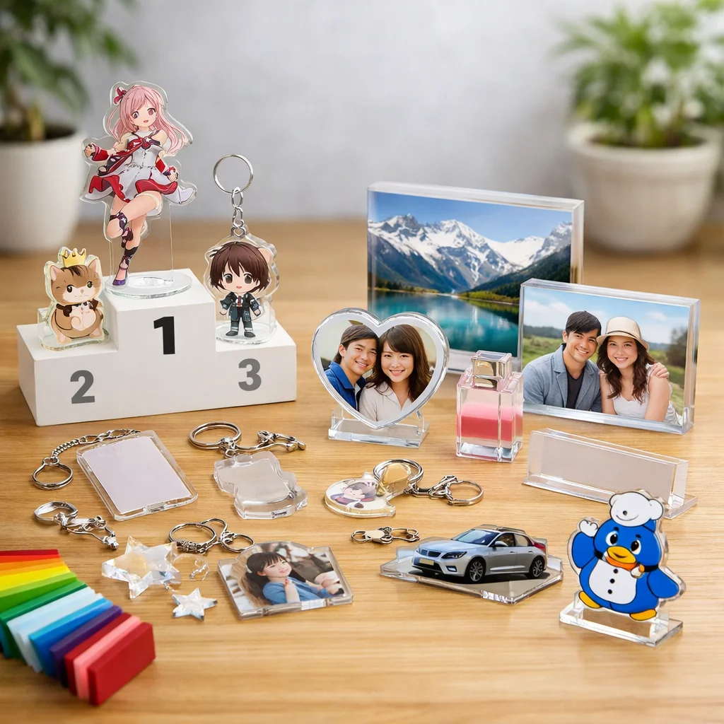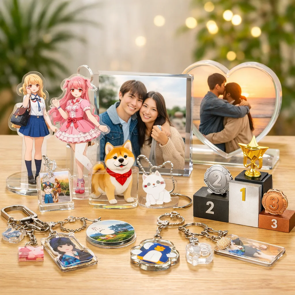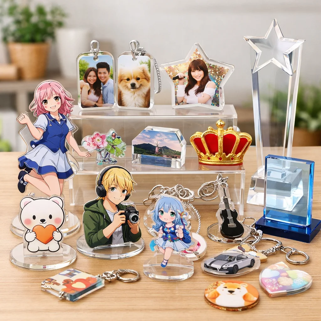 参考: 【2025年版】UVプリンターの特徴とメーカー別比較_基礎編 アクリルグッズ市場のトレンドと今後の展望![]() アクリルグッズ市場は、近年急速に拡大しており、デザイン、加工技術、購買行動、そしてイベント需要の各側面で顕著な変化が見られます。これらのトレンドを制作側と購入側の視点から整理し、今後の方向性を探ります。 デザインのトレンド アクリルグッズのデザインは、シンプルでありながら機能的なものが好まれる傾向にあります。特に、透明感を活かしたミニマルなデザインや、カラーバリエーションを豊富に取り入れた製品が人気を集めています。これにより、アクリルグッズの市場は多様化し、消費者のニーズに応える製品が増加しています。 加工技術の進化 アクリルグッズの製造において、レーザー加工やUV印刷などの高度な技術が導入されています。これらの技術により、複雑なデザインや高精度な加工が可能となり、製品の品質向上と多様化が実現しています。また、環境への配慮から、リサイクル可能なアクリルグッズの需要も高まっています。 購買行動の変化 消費者の購買行動は、オンラインショッピングの普及とともに変化しています。特に、SNSを活用した情報収集や口コミが購買決定に大きな影響を与えています。これにより、アクリルグッズの販売戦略もデジタル化が進み、オンラインでのプロモーション活動が重要視されています。 イベント需要の増加 アクリルグッズは、企業のプロモーション活動やイベントでの記念品としての需要が高まっています。特に、カスタマイズ可能なアクリルグッズは、ブランドの認知度向上や顧客とのエンゲージメント強化に寄与しています。これにより、アクリルグッズの市場は企業向けの需要も拡大しています。 今後の方向性 今後、アクリルグッズ市場は、環境への配慮やデジタル技術の活用が一層進むと予想されます。具体的には、リサイクル可能な素材の使用拡大や、AR(拡張現実)技術を活用した製品体験の提供などが挙げられます。これらの取り組みにより、アクリルグッズの市場はさらに活性化し、消費者の多様なニーズに応える製品が登場するでしょう。 アクリルグッズ市場の成長は、デザインや加工技術の進化、消費者の購買行動の変化、そしてイベント需要の増加といった要因に支えられています。今後もこれらのトレンドを注視し、アクリルグッズの市場動向を把握することが重要です。 ここがポイント近年のアクリルグッズ市場は、デザインや加工技術の進化、オンラインショッピングの普及、企業イベントの需要増加などが顕著です。環境への配慮やデジタル技術の活用が今後の方向性となり、多様なニーズに応える製品が期待されます。 参考: 人気アイテムランキング|Tシャツプリント|印刷通販【デジタ】 2023年の人気アクリルグッズのデザインや機能![]() 2023年前後におけるアクリルグッズのデザインや機能には、以下のような流行りの仕様が見られました。 1. ホログラム加工 アクリルグッズにホログラム加工を施すことで、光の角度や視点によって色彩が変化し、視覚的な魅力が増しました。この技法は、特にアクリルグッズの表面にホログラムフィルムを貼ることで実現されます。 2. オーロラ加工 アクリルグッズにオーロラ加工を施すことで、虹色の輝きを持つ製品が人気を集めました。この加工は、アクリルグッズの表面にオーロラフィルムを貼ることで実現されます。 3. ラメ加工 アクリルグッズにラメを加えることで、キラキラとした輝きを持つ製品が流行しました。この加工は、アクリルグッズの内部にラメを封入することで実現されます。 4. 偏光加工 アクリルグッズに偏光加工を施すことで、角度によって色が変わる製品が人気を集めました。この加工は、アクリルグッズの表面に偏光フィルムを貼ることで実現されます。 5. 両面印刷 アクリルグッズの両面に印刷を施すことで、視覚的な深みや立体感を演出するデザインが増えました。この手法は、アクリルグッズの両面に印刷を行うことで実現されます。 6. 重ねアクリル 複数のアクリルグッズを重ね合わせることで、立体的なデザインや奥行きを持つ製品が流行しました。この手法は、異なる厚みや色のアクリルグッズを重ねることで実現されます。 7. 立体台座 アクリルグッズに立体台座を組み合わせることで、ディスプレイ効果を高めるデザインが人気を集めました。この手法は、アクリルグッズの下部に立体台座を取り付けることで実現されます。 8. カニカンの種類 アクリルグッズのカニカン部分に多様なデザインやサイズを採用することで、機能性とファッション性を両立させた製品が増えました。この傾向は、アクリルグッズのカニカン部分に様々なデザインやサイズを採用することで実現されます。 9. 保護フィルム アクリルグッズの表面に保護フィルムを貼ることで、傷や汚れから守る機能が強化されました。この手法は、アクリルグッ