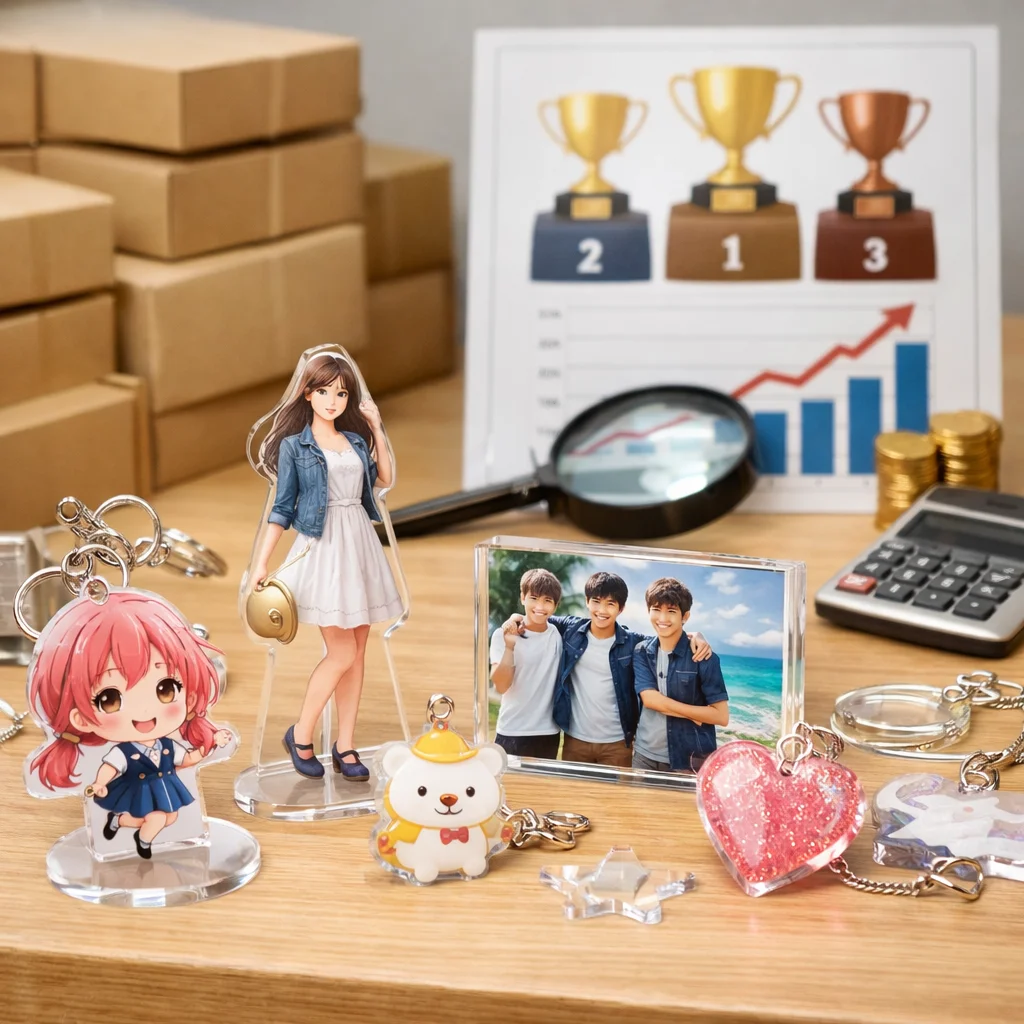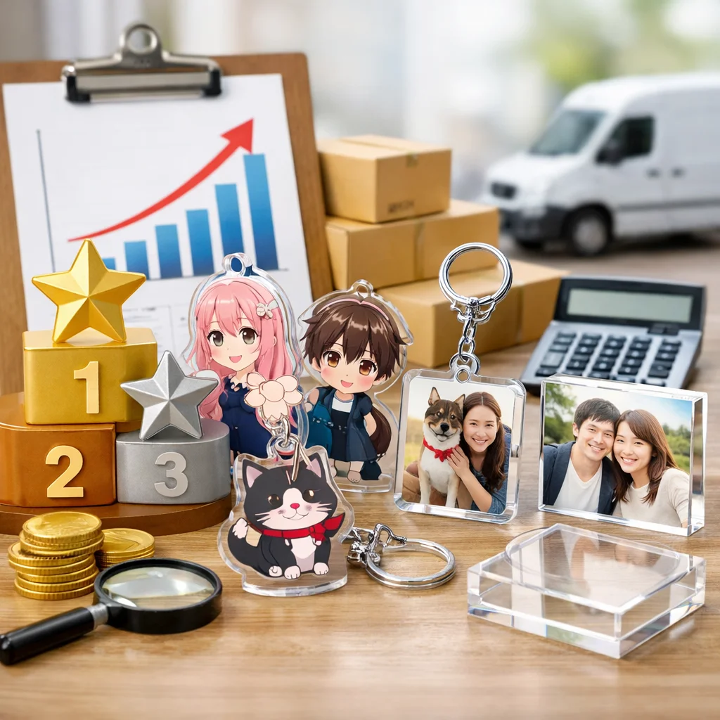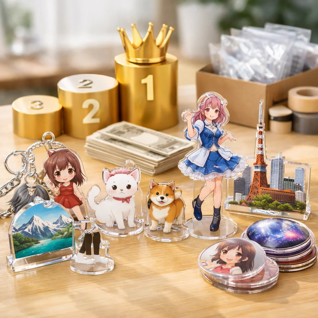 アクリルグッズ市場は、小ロット短納期、特殊加工、エコ素材志向、オンデマンド高度化のトレンドが進行中です。これにより、安い業者が求められ、ランキングでも注目されています。