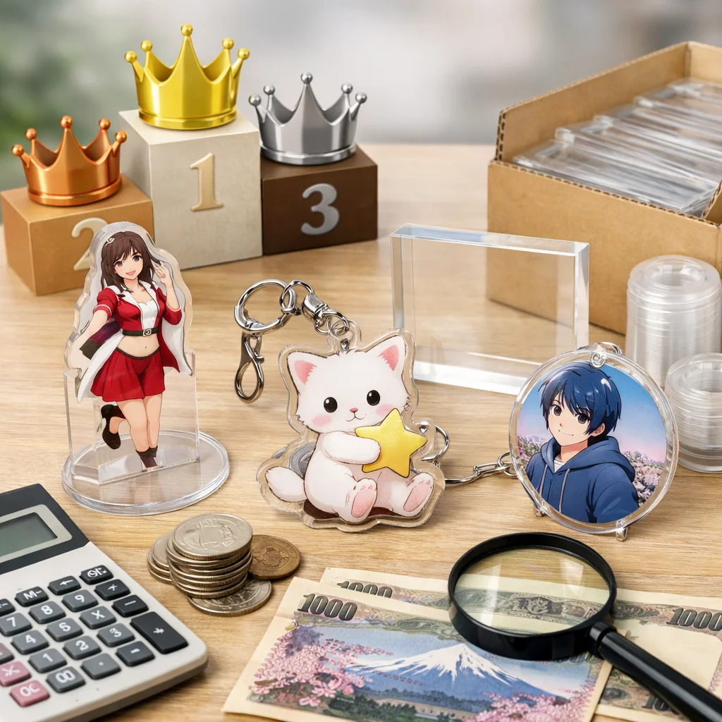 アクリルグッズを購入する際は、単に価格だけでなく総額で判断することが重要です。送料やオプション、予備率、不良対応コストを考慮し、同人、ノベルティ、物販それぞれの目的に応じた業者選びとランキングを参考にすることで、コストパフォーマンスを最大化できます。