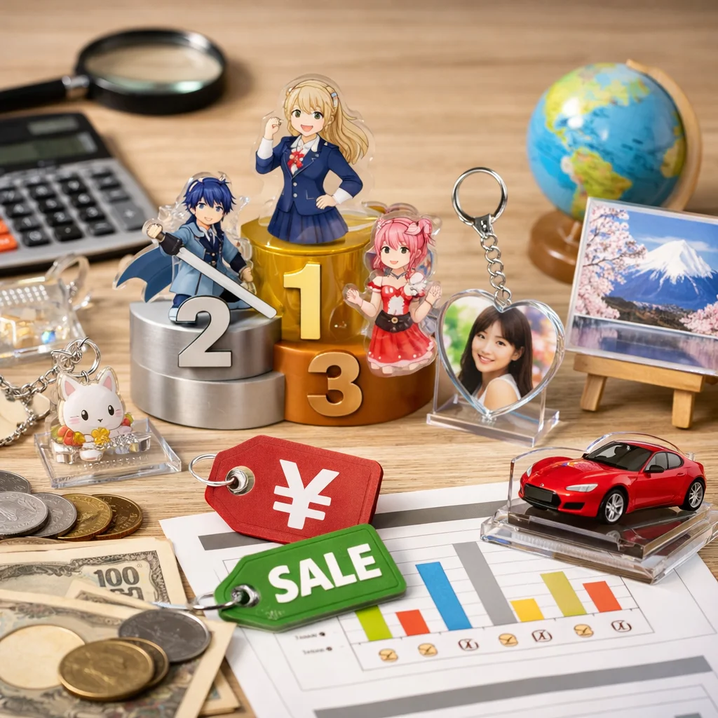 日本国内におけるアクリルグッズの価格は、アイテムの種類や仕様、発注数量によって大きく変動します。以下に、主要なアクリルグッズの価格帯をアイテム別、仕様別、発注数量別に整理し、国内での比較を行います。