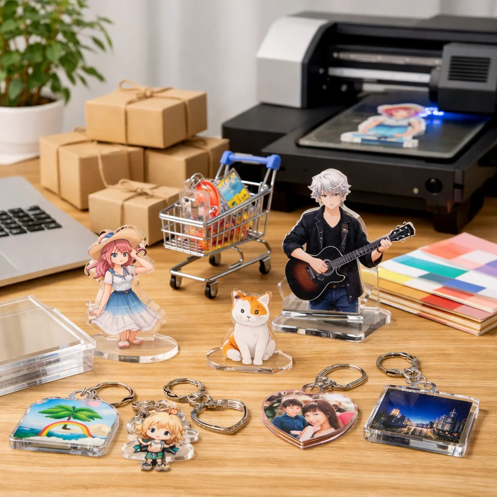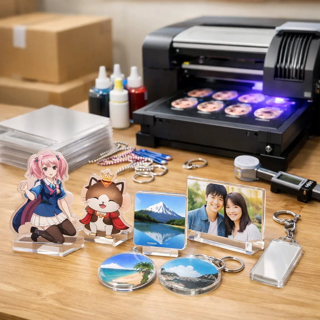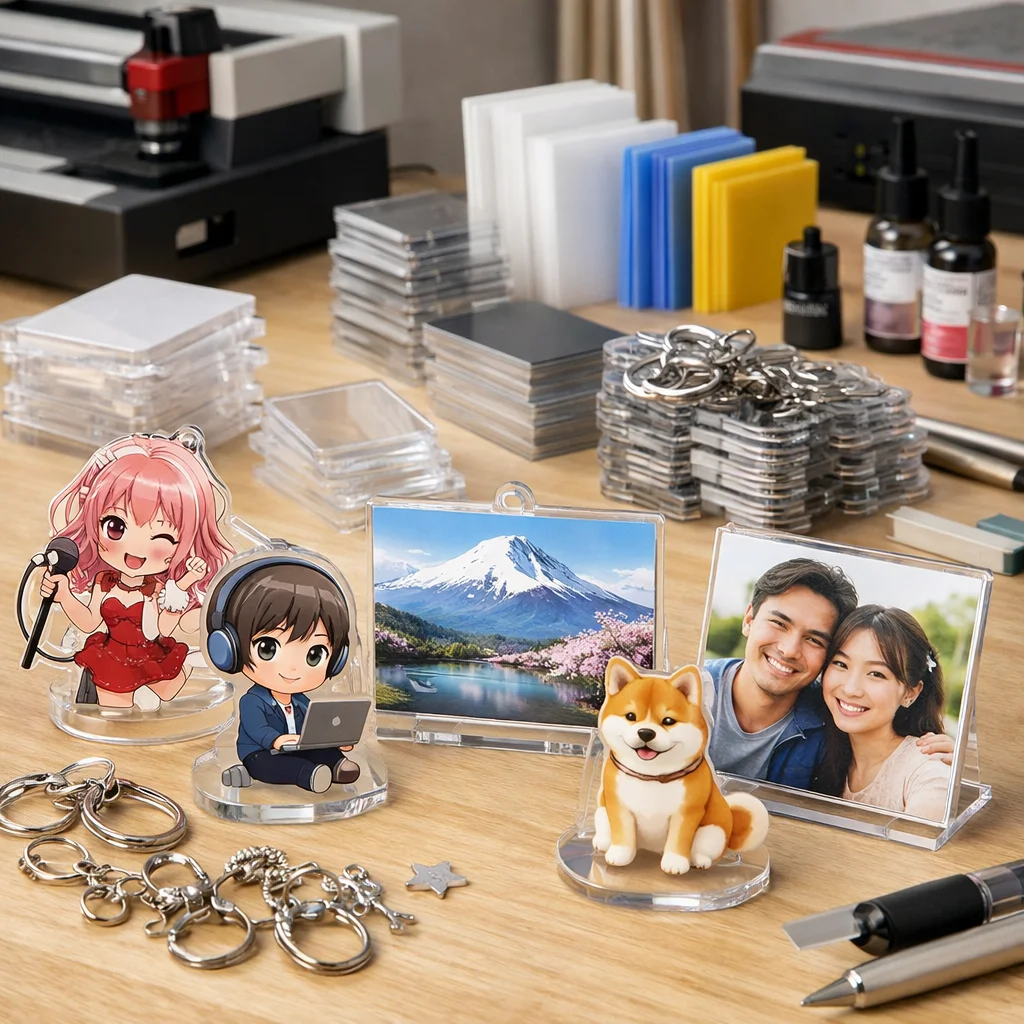 以下に、代表的なアクリルグッズの価格帯を、サイズ、厚み、印刷方法、数量別にまとめました。また、送料、金具、包装、校正費などの「見落としコスト」も併せてご紹介します。