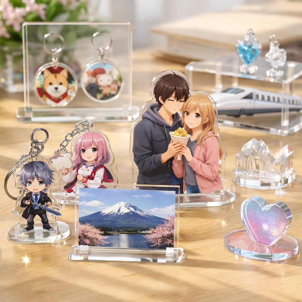 アクリルグッズは、ポリメチルメタクリレート(PMMA)という素材で作られたさまざまなアイテムを指します。代表的な形状としては、アクリルキーホルダー(アクキー)、スタンド、フィギュアなどがあり、これらは主にアニメやゲームなどのキャラクターをテーマに作られ、ファンからの人気を集めています。アクリルグッズはその透明度の高さや耐久性、軽さから、様々なデザインや用途に応じて広く使われています。