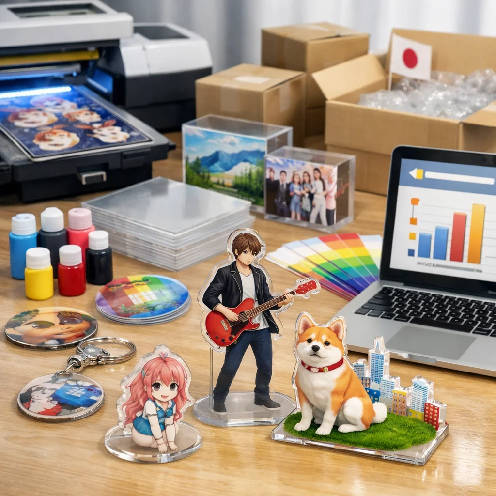 国内のアクリルグッズ市場は、推し活や同人、ノベルティ、小ロット需要に応えながら拡大しています。業者は主に直販工場、印刷通販、同人特化、ノベルティ商社、デザイナー連携、UVインクジェット中心に分類され、それぞれ異なる特徴や用途に特化しています。目的に応じた業者選びが重要です。